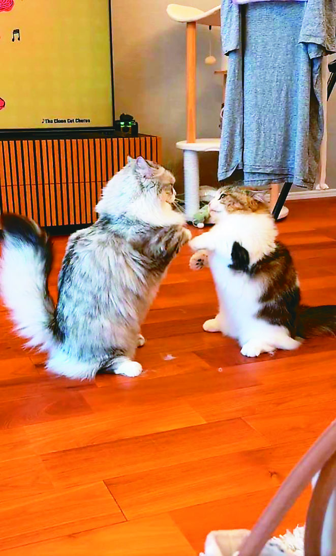 【本報綜合外電報導】毛小孩日常生活中,即便跟同伴感情再好,仍不免與對方打鬧。日本一名飼主分享,平時形影不離的2隻愛貓,突然在客廳大打出手,不斷用毛茸茸的小手互相抓撓對方,飼主將這場毫無殺傷力的打鬧,評為「世上最和平的互毆」,影片曝光後,瞬間逗樂大批網友。