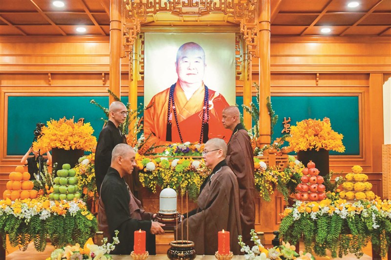 覺誠法師(前排右)與慧性法師(前排左)共同將星雲大師舍利塔安奉於祖師堂內,儀式莊嚴肅穆。圖/人間社記者胡柏瑜