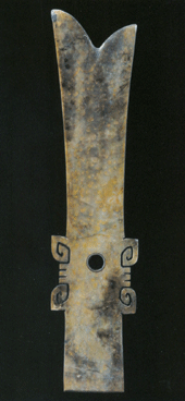 璋,是一種類似刀,戈,斧之類的兵器。這件出土於四川三星堆文化的玉牙璋,體型碩大,風格迥異於中原文化的牙璋。玉璋應為地方青玉雕成,全器已經受沁呈乳黃色,間有白斑,打磨細緻。器表的上部雕琢有一隻鳳鳥,證明了這件玉器是禮儀用具,而非實際用於殺伐的兵器。中間和下方各雕琢有兩個鑽孔,顯示出能夠綁附於其他的材質,共同形成一件玉禮器!而玉器下端的兩側,都有鋸齒般的出牙,根據台北故宮博物院鄧淑蘋女士的研究顯示,這種出牙狀的裝飾紋,應該是先祖人面的側面寫照,而這位「先祖」,就是大家所熟知的「嫦娥」!