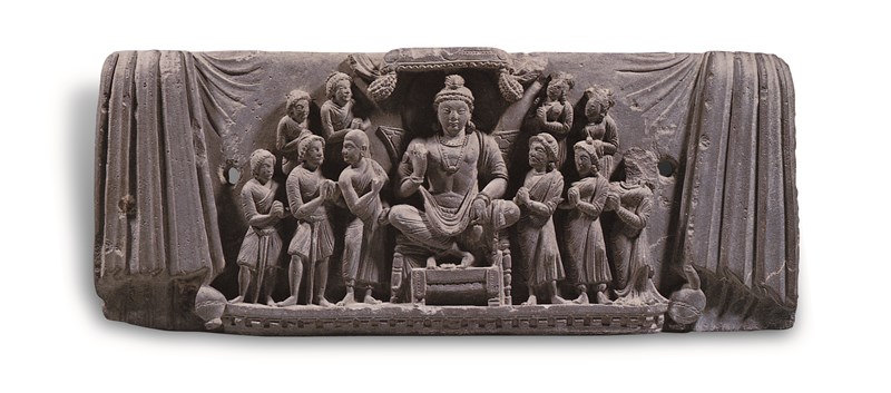 巴基斯坦開伯爾巴圖克瓦省查爾沙答(Charsadda,Khyber Pakhtunkhwa)出土,此浮雕應該是佛像台座上的一部分。表現彌勒菩薩在兜率天說法的情景。彌勒菩薩繼釋迦牟尼佛之後,將於娑婆世界下生成道,為未來佛。據《觀彌勒菩薩上生兜率天經》載,彌勒菩薩將出生於婆羅門貴族,其後出家修行,而手中所提的淨水瓶象徵啟迪眾生智慧,如甘露之遍灑。