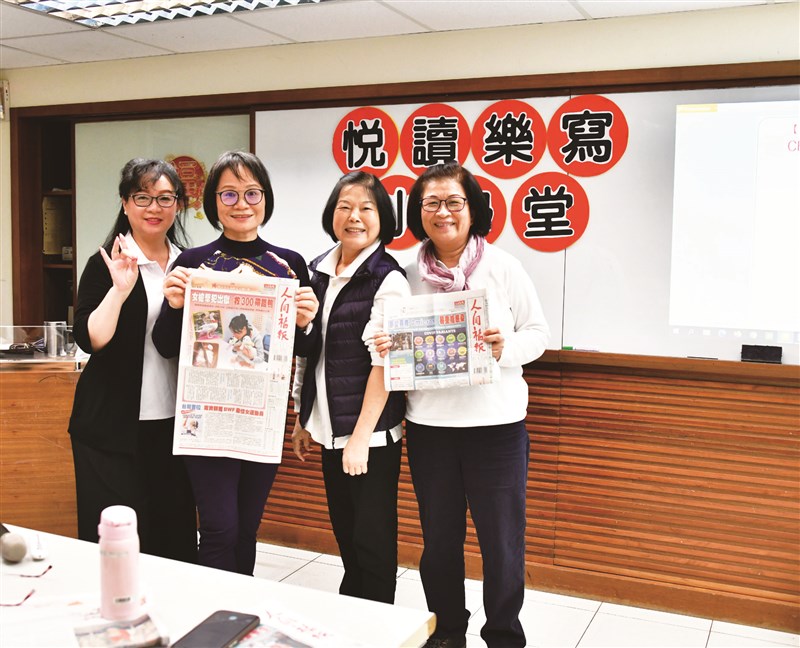作者(左二)多年來以《人間福報》為範本,協助基隆極樂寺推動閱讀與寫作。