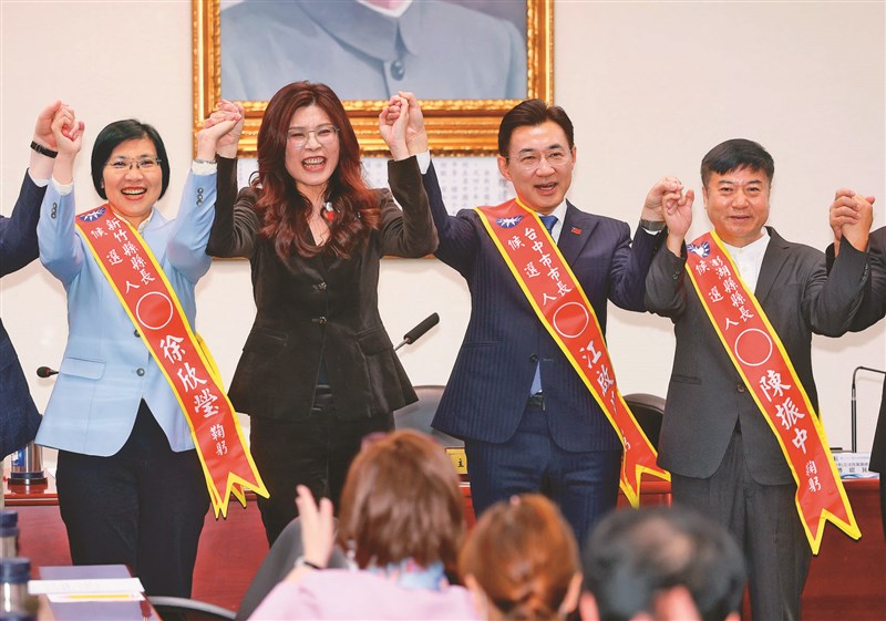 國民黨黨主席鄭麗文(左2)昨在中常會宣布提名3位縣市長參選人,包括立委徐欣瑩(左起)參選新竹縣長、立法院副院長江啟臣參選台中市長、澎湖縣湖西鄉長陳振中參選澎湖縣長。圖/中央社