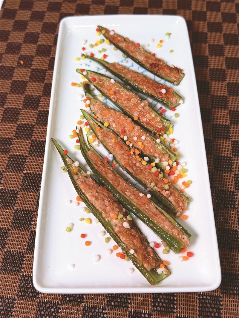 ❺平底鍋加少許油,先將填餡面朝下,以小火煎至金黃,再翻面煎熟,即可完成秋葵鑲素肉。