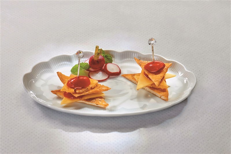 ❹依序將白玉豆乾、番茄片、起司片、白玉豆乾、鳳梨、起司、白玉豆乾、番茄等由下往上層層斜置堆疊,最後以水晶籤或竹籤固定。