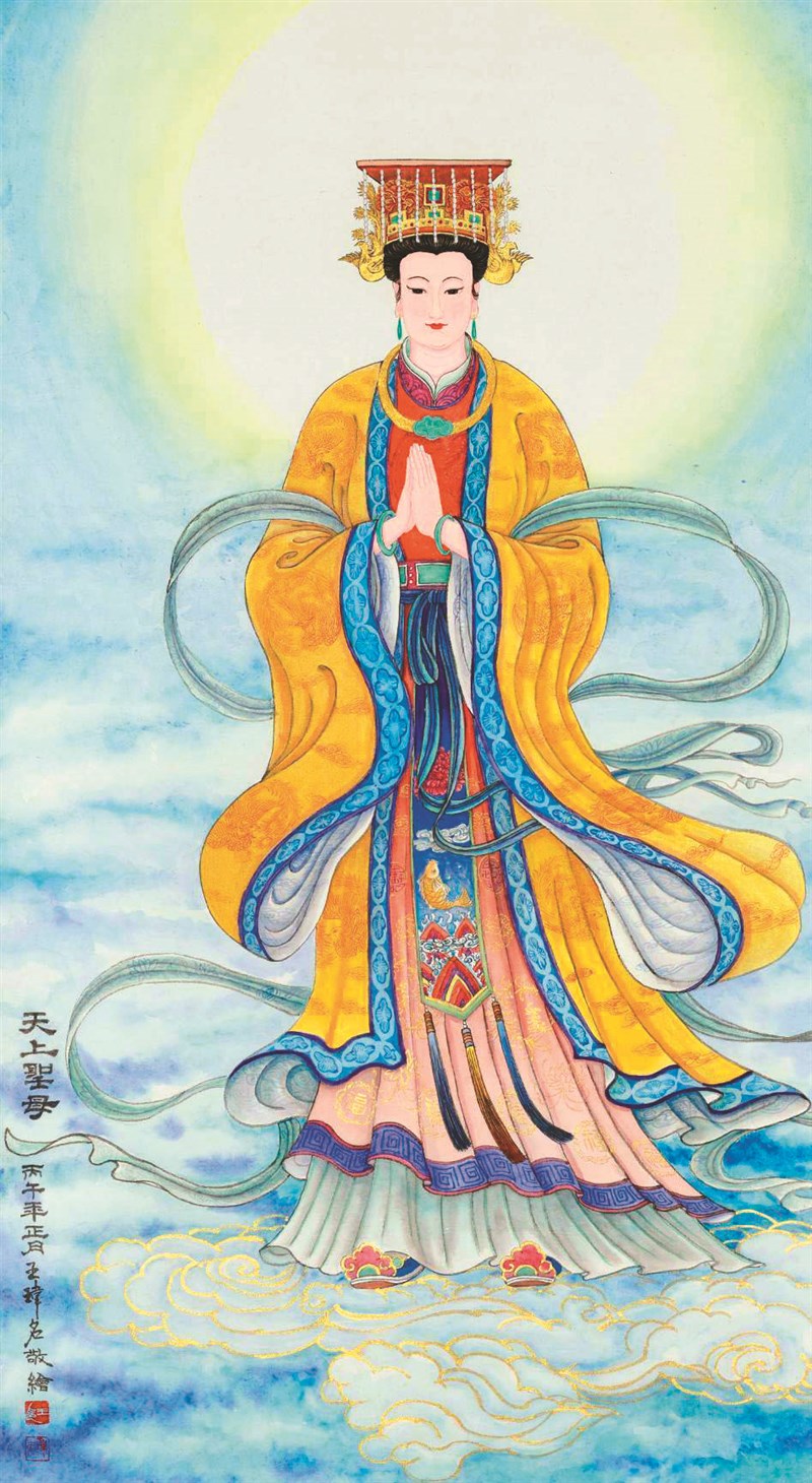 本件水墨創作以「天上聖母」為核心意象,融合傳統工筆與現代審美語彙,呈現媽祖慈悲莊嚴、庇佑萬民的形象。柔和的色彩與流動的衣紋,象徵媽祖慈悲如水、無所不在的護佑力量;背景雲氣,則寓意信仰的流轉與天地之間的連結。期望在喧囂的時代,以靜謐莊嚴的畫面展現信仰的安定力量。
