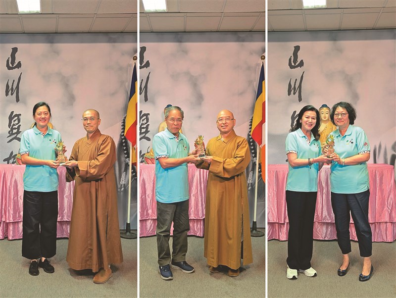 典禮頒發優秀協會獎,約堡協會獲「教育推廣獎」(圖中),由佛光山副住持慧倫法師頒發。普利托利亞協會(圖左)、德本協會(圖右)獲「慈善服務獎」,分別由南華寺住持慧昉法師、世界總會理事陳阡蕙頒發,肯定在地深耕貢獻。
