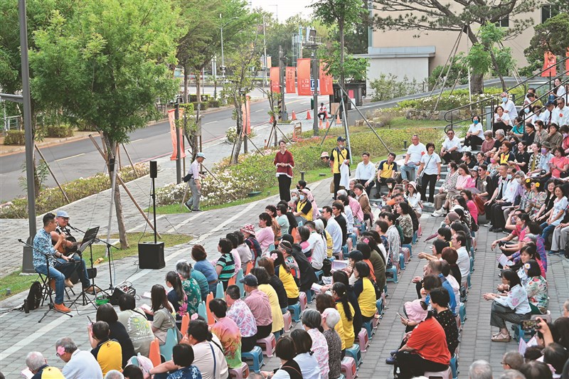 在繁花綠樹圍繞中,逾300位市民在惠中寺愉快地享受一場民歌音樂會。圖/人間社記者童瀚誴