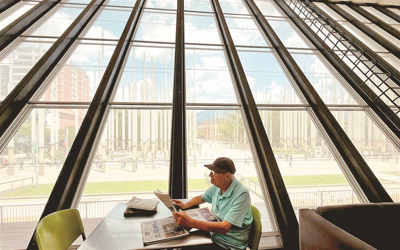聯合國教科文組織宣布,哥倫比亞麥德林獲選為「2027年世界圖書之都」,以表彰其促進閱讀的政策。麥德林擁有超過110家書店與25座圖書館。圖為一位長者在圖書館閱讀報紙。 圖/法新社