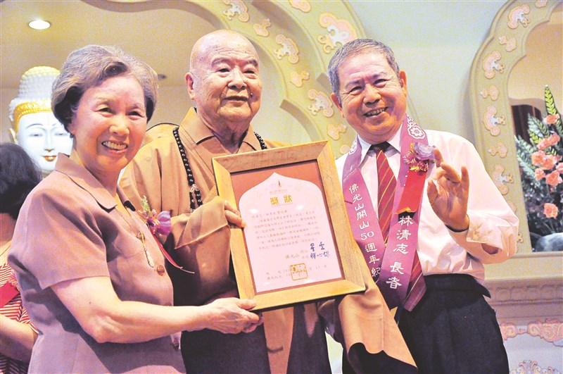 2016年佛光山開山五十周年。星雲大師(中)感謝所有信徒的護持,並親自頒贈感謝狀予多年來卓越貢獻者,用具體行動表達對他們的感念。圖為大師與長年擔任監獄佈教師的弟子林清志(右)、林秀美(左)賢伉儷合影。圖/資料照片