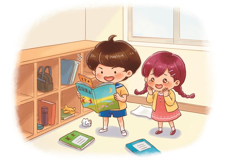 一早,學藝股長林靜靜催交作業時,大頭妹竟慌張的翻找著文具、課本擺放整齊的置物櫃,自言自語著:「明明就放進置物櫃,怎麼就找不到?」「生字作業妳該不會忘了寫吧!」林靜靜等得不耐煩,語氣還能聞到一股懷疑的氣味。