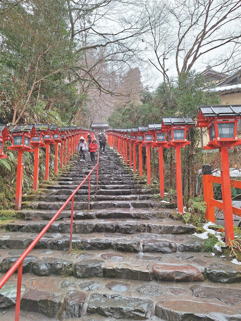 冬季來到此地,只見神社大紅鳥居右側,豎立著「總本社貴船神社」的石碑。拾級而上,即是左右皆有朱紅燈籠的綿長石階參道,氣氛靜謐而溫馨。