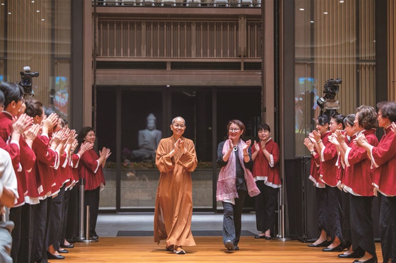 二○二五年佛光山惠中寺「未來與希望」講座,作者受邀演講,由住持覺居法師帶領入場。圖/資料照片