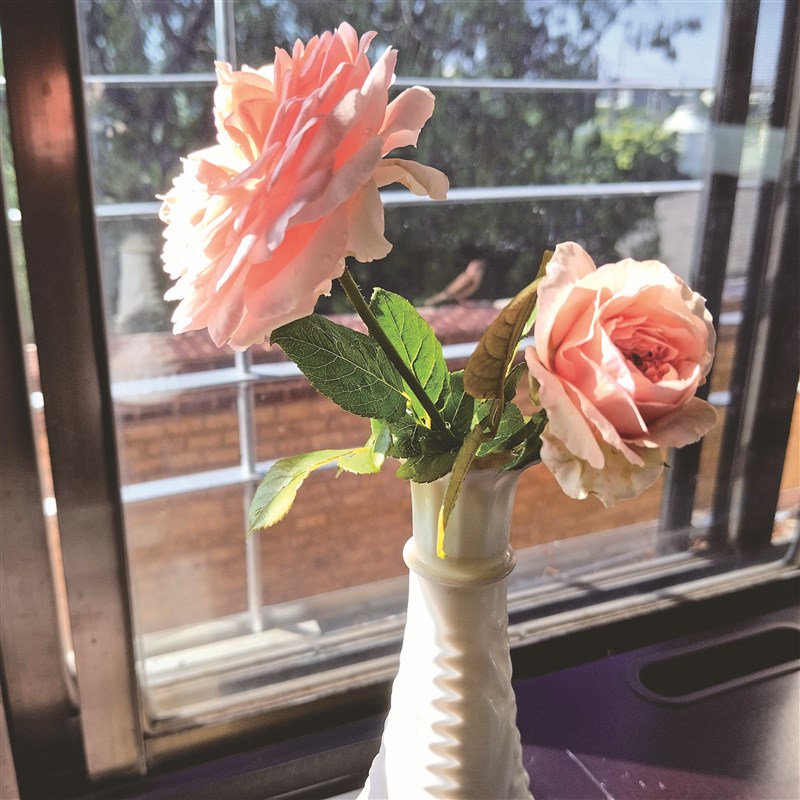 一日,見粉嫩薔薇朵朵盛放,花顏繽紛燦然,隨意剪擷掇成瓶花置於書桌。陽光灑落光影悠悠,襯著庭院裡的綠意盎然,剎那即永恆的感動充盈心懷;或許日子總在庸碌繁雜紛擾中打轉著,不斷重複迴放,仍然可以在間隙間保有些許閒暇與餘裕,選擇安然自得與從容自在,欣賞花開芬芳的美好,再平淡無奇的日常也會自然成為一方靜好,閃耀著煦煦溫柔的光。