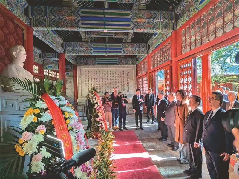 國民黨主席鄭麗文(右3)率領高層,11日到訪北京香山碧雲寺,在孫中山紀念堂內行禮。圖/廖士鋒