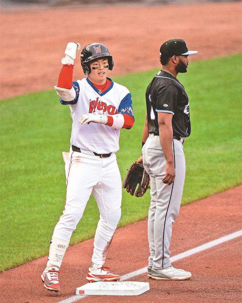 旅美小將鄭宗哲10日在MLB美國職棒波士頓紅襪3A面對克里夫蘭守護者3A比賽中,繳出個人生涯也是球團首次完全打擊,圖為他安全上壘後為自己歡呼打氣。