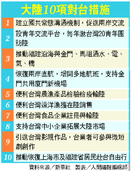 陸恢復滬閩遊客 來台自由行 |2026.04.13 語音朗讀 44觀看次 字級 大 中 小 大陸昨天宣布10項惠台措施,開放上海、福建陸客來台自由行及開放兩岸多個城市航點。圖為中國南方航空班機抵達桃機時經過國旗。圖/黃仲明國民黨主席鄭麗文(前排右2)昨天訪陸行最後一站到小米汽車超級工廠參觀,小米集團董事長雷軍(前排右3)親自到場接待。圖/國民黨提供大陸10項對台措施 資料來源/新華社 製表/人間福報編輯部 【本報綜合報導】中國國民黨主席鄭麗文訪陸「和平之旅」,歷經鄭習會高潮後,於昨日畫上句點。大陸方面宣布10項利多,重點包含推動恢復上海及福建民眾來台自由行,支持盡快恢復烏魯木齊等兩岸航點;另將為台灣農漁產品輸入大陸提供便利;允許引進台灣電視劇、紀錄片。鄭麗文昨日午後自北京首都機場搭機返台,由中共中台辦主任宋濤等多位官員送行。鄭麗文與宋濤在停機坪道別時說了不少話,她對宋濤表示感謝,宋濤並說「保持聯繫,後會有期」。稍早在昨日上午10時,中共中台辦即透過新華社「授權宣布」10項「促進兩岸交流合作」政策措施,涵蓋觀光、交通、農漁產品及文化等領域,其中以恢復陸客來台與農漁產品輸陸最受關注。觀光方面,大陸提出推動恢復上海市與福建省居民赴台自由行,並支持兩岸空中客運直航正常化,包含烏魯木齊、西安、哈爾濱、昆明、蘭州等航點復航,朝疫情前71個城市直航規模邁進。此舉被視為兩岸觀光市場重啟的重要訊號。鄭麗文一行8人於昨天下午4時53分搭乘中國國際航空CA-189航班抵達桃園國際機場;國民黨立法院黨團總召傅崐萁率團到機場內接機。鄭麗文受訪時表示,如同在「鄭習會」時她所說的,事情要一件一件做,路要一步一步走,這一次,中國國民黨踏出了成功的第一步,後面還有99步的路要走。鄭麗文說,希望中國國民黨可以提供大家很多具體的管道,直接的、能感受到、接受到兩岸和平發展的和平紅利。商總:對台經濟有大幫助府院昨天同聲表示,兩岸任何開放措施,都涉及政府公權力與制度管理事項,任何交流安排都不應附帶政治前提,更不應淪為特定政黨政治操作或交易的籌碼;中共把交流工具化、經貿武器化的統戰脅迫作法,若真有意推動相關措施,應透過既有溝通聯繫管道,與我方政府主管機關展開協商。總統府發言人郭雅慧說,中國常將兩岸交流工具化、武器化,各項措施帶有高度不確定性,時開、時斷,多年來對我國產業、農漁民帶來難以估計的傷害;這次公布的10項措施,毫無遵循市場機制及國際規範,且一如過去不循既有管道與我國政府洽商,此次中國是否又把兩岸事務故技重施為經濟脅迫?商總榮譽理事長賴正鎰就上述政策措施表示,相信對台灣經濟會有很大的幫助。台灣的觀光工商業界與台商都希望盡快恢復兩岸直航與觀光,以平衡台灣日益增長的觀光逆差。花蓮、日月潭、阿里山及士林夜市等地指出,過去陸客為主要客源之一,帶動旅宿、餐飲與零售消費。近年人潮減少,產業明顯萎縮,若自由行與航班恢復,可望帶動人流回升,挹注地方經濟。旅遊業期待 農漁業審慎旅行業者則指出,市場能否真正復甦,仍取決於政策配套,包括團客限制與簽證安排是否同步鬆綁,並呼籲政府盡速提出因應措施。不過,農漁與外貿業者多持審慎態度。業界指出,過去曾多次因政策或檢疫問題暫停進口,如鳳梨、鳳梨釋迦與石斑魚等案例,顯示不確定性仍高;加上大陸內需消費轉弱,實際效益仍待觀察。學者亦認為,農產外銷應回歸市場機制與品質競爭,而非依賴政策讓利。 前一篇文章 汽、柴油本周續凍漲 中油已吸收逾百億元 下一篇文章 美伊21小時談判破局 川普令封鎖荷莫茲海峽 熱門新聞 01【分數之外】看見另一種英文2026.04.0802租賃車業者違法攬客 觀光署:最高罰200萬元2026.04.0703清明豪雨 合歡溪出現新堰塞湖2026.04.0904杉林溪園區 紫藤花盛開2026.04.0805計程車掛牌費喊到35萬元 交部出手2026.04.0806火金姑故鄉 賞螢好去處2026.04.0907哥國動盪城 變身世界圖書之都2026.04.0808【練瑜伽品生活】英雄式二 英雄不能只看正面2026.04.0809美伊談判 45天停火協議2026.04.0710吃素也能大補「鐵」 開心果芝麻含量豐2026.04.08 訂閱電子報 台北市 天氣預報 台灣一週天氣預報 相關報導 美伊21小時談判破局 川普令封鎖荷莫茲海峽美伊談判 川普增兵施壓鄭習會 鄭:兩岸和平制度化以轟黎巴嫩 伊朗關荷莫茲美伊停火2周 雙方首達共識 中東戰爭 百萬兒童流離失所