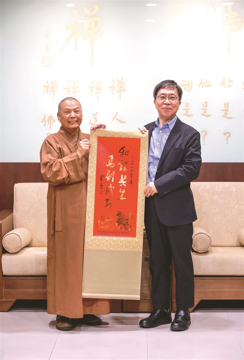 佛光山常務副住持慧傳法師(左)致贈星雲大師墨寶卷軸,予高雄市國稅局長許寧佑。圖/人間社記者慧裴