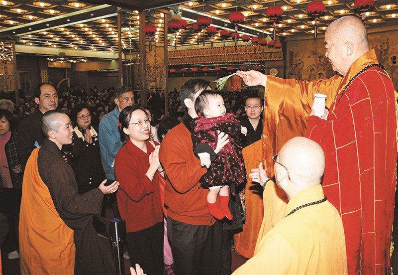 沒多久,法會進入尾聲,司儀要眾人排好隊伍,依序繞到台前,接受星雲大師加持,只見他以楊枝沾著甘露水,為眾人灑淨、灌頂、祈福。由於人數眾多,我和太太排在隊伍後方耐心等待,大概等了有半小時之久才輪到我們,卻見大師始終慈眉善目,從容為新入佛門的凡夫俗子們灑甘露,沒有一點不耐煩的情緒。