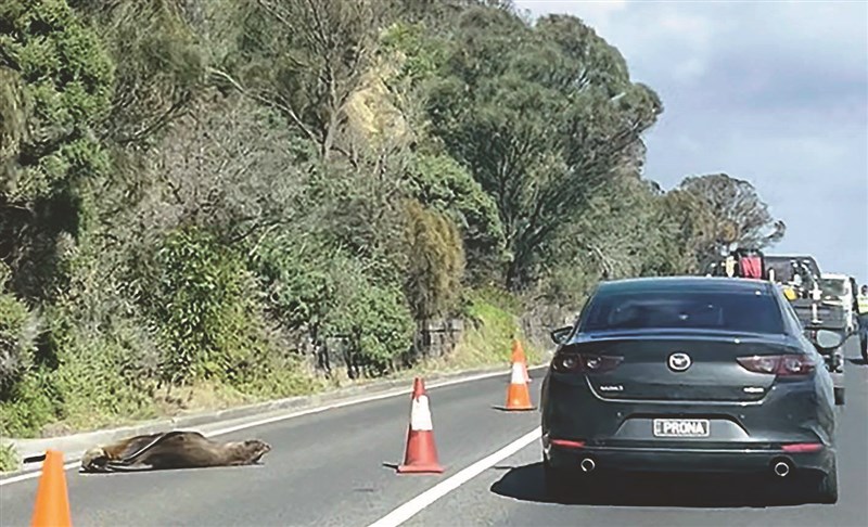 【本報綜合外電報導】澳洲維多利亞州南部沿海小鎮德羅馬納(Dromana),日前因為一隻海豹在一條主要道路上睡著,雖然造成交通阻塞,但卻讓駕駛欣喜不已,最終牠被野生動物救援人員送回海邊。