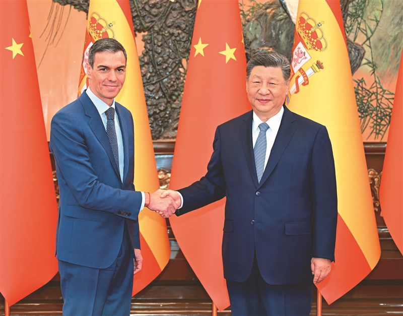 中國大陸國家主席習近平(右)14日在北京人民大會堂會見西班牙總理桑傑士。圖/新華社