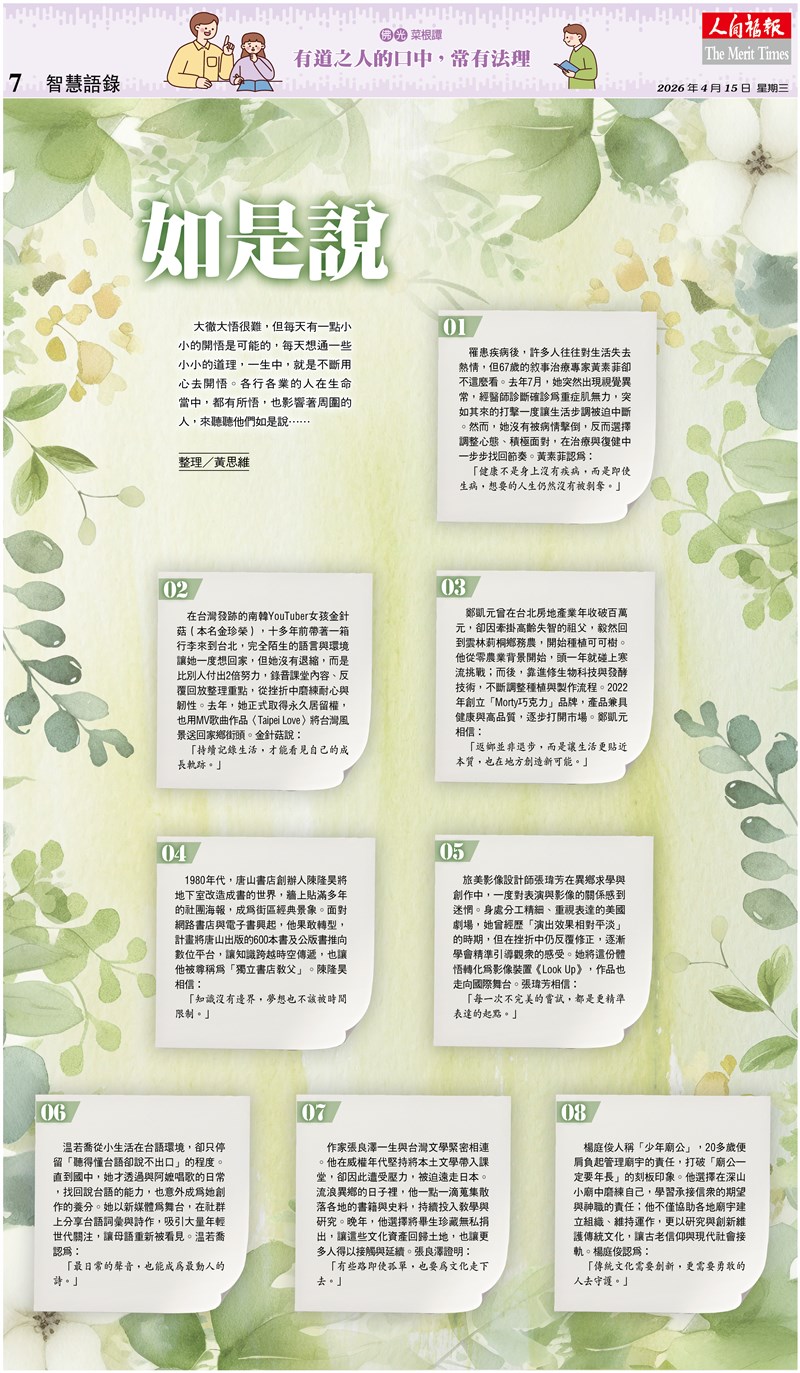 罹患疾病後,許多人往往對生活失去熱情,但67歲的敘事治療專家黃素菲卻不這麼看。去年7月,她突然出現視覺異常,經醫師診斷確診為重症肌無力,突如其來的打擊一度讓生活步調被迫中斷。然而,她沒有被病情擊倒,反而選擇調整心態、積極面對,在治療與復健中一步步找回節奏。黃素菲認為: