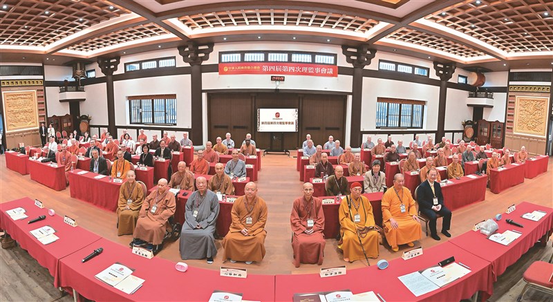 中華人間佛教聯合總會4月9日於苗栗月稱光明寺,舉行第四屆第四次理監事會議,主席團主席心保和尚(前排左4)、如淨法師(前排右4)、首愚法師(前排左3)、心道法師(前排右3)、悟因長老尼(前排左2)、吳志揚(前排右1),監事長明光法師(前排右2)及祕書長覺培法師(前排左1),逾百人與會。圖/中華人間佛教聯合總會提供