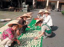 許多蘭陽仁愛之家的義工,一早便「跪蹲著」把燙過的豆腐乾整齊的排放在大殿前的廣場,但是天公不作美,沒多久飄來一大片烏雲,許多人衝出來搶收豆腐乾,幸好大家手腳迅速,將豆腐乾保護的相當周到,都未曾淋到雨。