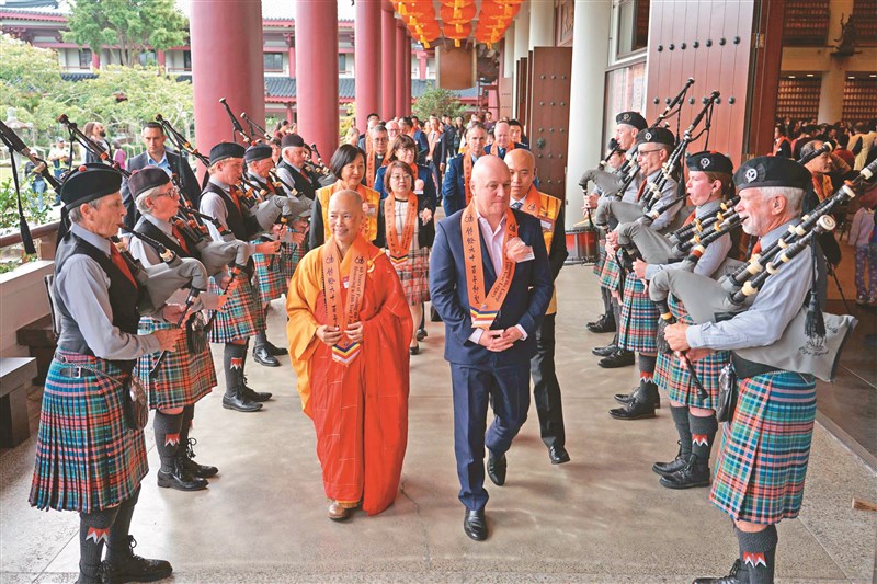紐西蘭北島佛光山4月11日舉辦「傳燈六十 百年仰望.佛誕節為世界和平祈福法會」,以蘇格蘭管弦樂團奏響樂章,迎接紐西蘭總理盧克森Rt Christopher LUXON(中右)、紐西蘭佛光山住持滿信法師(中左)等貴賓,進入會場。圖/紐西蘭佛光山提供