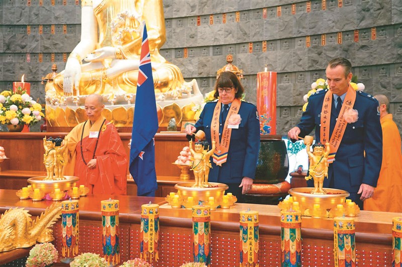 紐西蘭佛光山住持滿信法師(左)帶領紐西蘭警署部副警署長Jill ROGERS警監(中)、馬努考區首長Supt Shanan GRAY警監浴佛。圖/紐西蘭佛光山提供