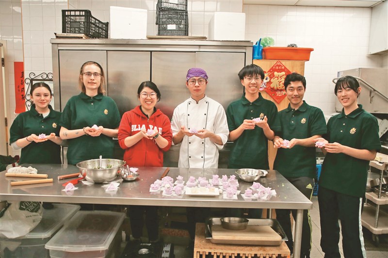 佛光大學蔬食系交流生楊健生(中)帶領學員製作點心,促進文化與技能交流。