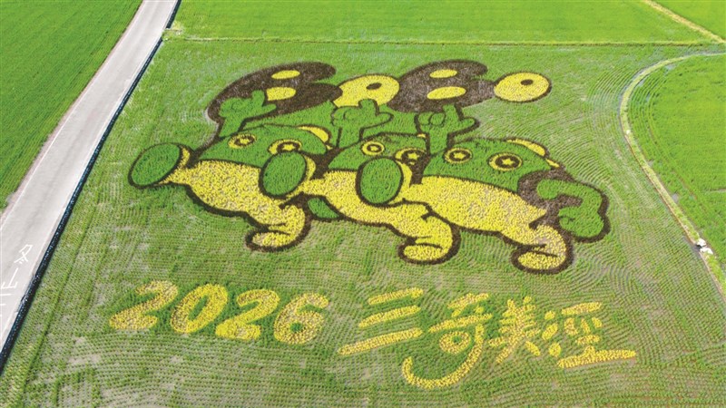 宜蘭縣冬山鄉「三奇美徑」每年春夏都以不同的彩繪稻田呈現多元意象,每當稻子成熟時,宛如金黃色大地畫布,吸引攝影愛好者或民眾前往拍照。今年以黃、黑、綠3種不同稻苗,在約0.3公頃田間呈現Q版波波草圖案,可愛吸睛,觀賞期將持續至6月底稻田收割時。圖/中央社