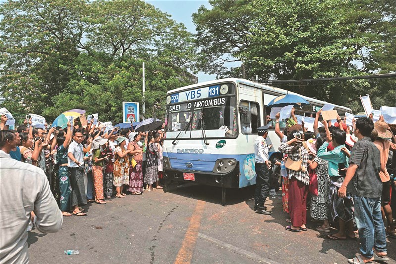 緬甸政府對前領導人翁山蘇姬減刑,並釋放前總統溫敏等數千人。圖為1輛載獲釋囚犯的巴士17日從仰光音山監獄駛出,囚犯家屬聚集在監獄門口迎接被囚的家人。圖/法新社