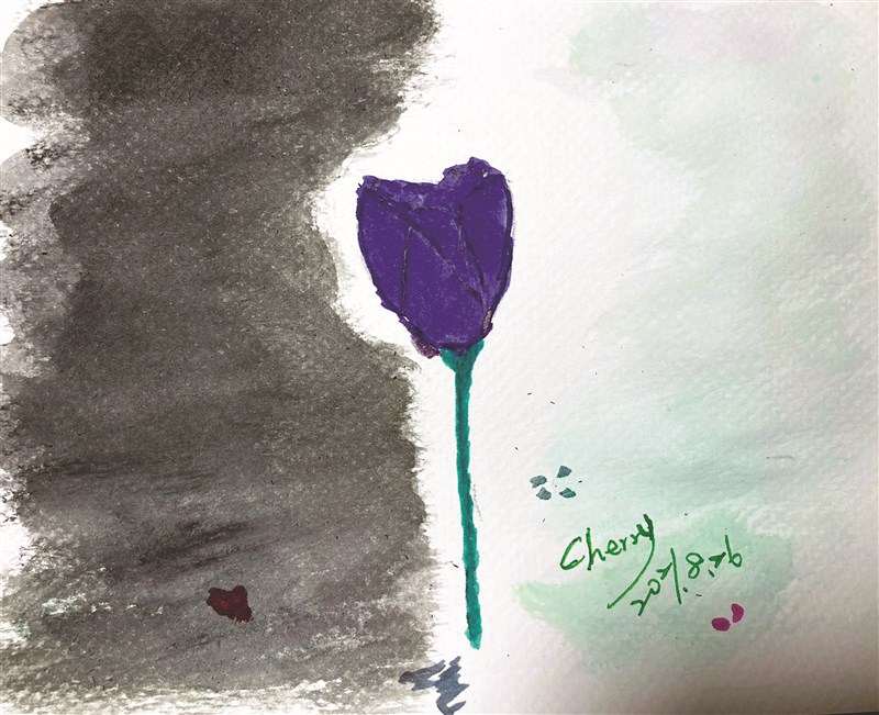 這朵周遭帶著綠色氛圍的紫色鬱金香花與山壁面對面,是否有過去是蘑菇的記憶?