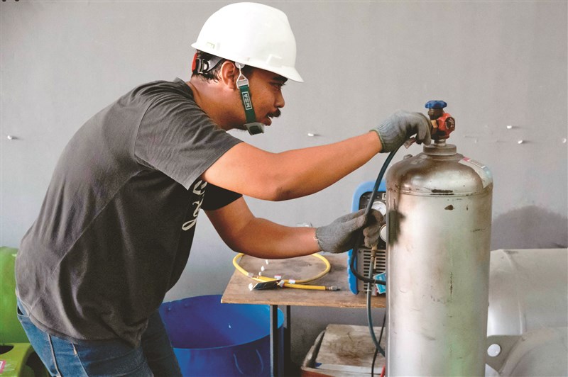 30歲的技師阿里(Ari Sobaruddin),在雅加達悶熱的天氣中,蹲在地下室一堆空調系統管線當中,等待真空幫浦緩慢地回收冷媒,這過程往往一次要耗時12小時。他說,這是他為對抗暖化盡的一份力,「事關保育、拯救自然」。