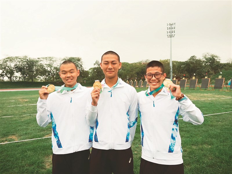 佛光青年羅名蓨(右)與陳彥廷(中)、簡苡倫(左),在全中運射箭國中組摘金。