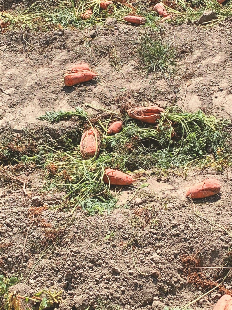 原來,每次的採收就是農夫們耕作的成績評量,外型筆直,色澤飽滿的紅蘿蔔是上品傑作,通常整批採收後會直接運往市集銷售;而外型不討喜,諸如環肥燕瘦或是表皮略帶斑點者,屬於賣相不佳的次級品,就續留在田裡當作農肥處理。也許是近年來,年輕人返鄉帶入「惜食」觀念,這些不合市場標準的「格外品」,依舊鮮甜可食,遂說服長輩們在網路張貼公告,開放一段時間供民眾免費撿拾。