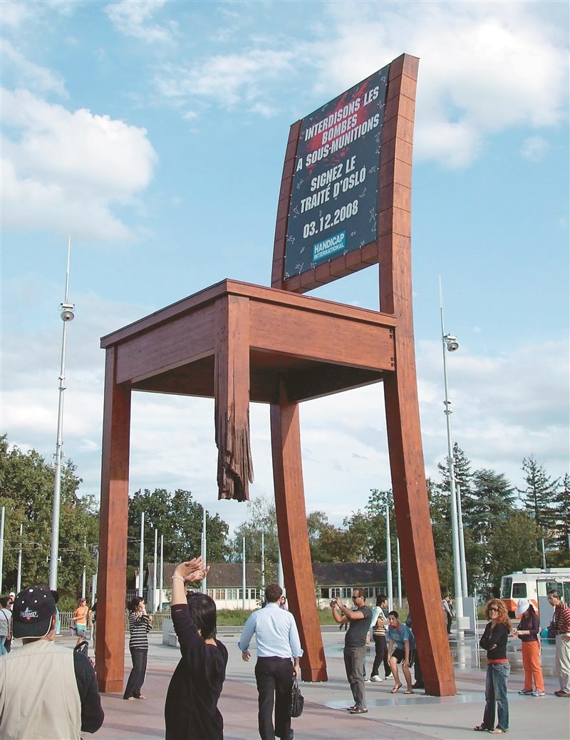 這一座雕塑「物」如其名,就叫〈斷腳椅〉(Broken Chair),矗立在瑞士日內瓦的「萬國宮」(Palais des Nations),也就是聯合國歐洲總部前方的廣場。斷裂的椅腳,象徵在殘酷戰爭中被炸斷肢體的無辜平民──特別是那些地雷受害者。它以具體的形象,毫不掩飾地呈現抽象的悲痛,令人印象深刻。