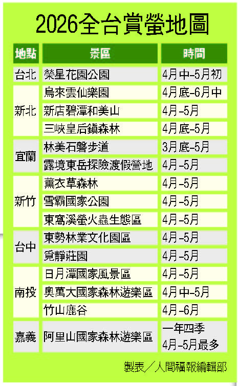 火金姑復育有成 螢光爆發 |2026.04.21 語音朗讀 37觀看次 字級 大 中 小 2026全台賞螢地圖 製表/人間福報編輯部台北 榮星花園公園 從減少農藥、改善水質到溪流棲地修復與降低夜間光害,全台各地螢火蟲數量明顯回升,並於4至5月間進入觀察高峰期。圖/台北市政府提供嘉義 阿里山林業鐵道 從減少農藥、改善水質到溪流棲地修復與降低夜間光害,全台各地螢火蟲數量明顯回升,並於4至5月間進入觀察高峰期。圖/嘉義縣政府提供南投 日月潭風景區 從減少農藥、改善水質到溪流棲地修復與降低夜間光害,全台各地螢火蟲數量明顯回升,並於4至5月間進入觀察高峰期。圖/南投縣政府提供嘉義 圓潭生態園區 從減少農藥、改善水質到溪流棲地修復與降低夜間光害,全台各地螢火蟲數量明顯回升,並於4至5月間進入觀察高峰期。圖/嘉義縣政府提供 【本報綜合報導】近年在台灣多項環境治理與棲地復育措施推動下,俗稱「火金姑」的螢火蟲棲息環境逐步改善,從減少農藥使用、改善水質,到溪流棲地修復與降低夜間光害,各地復育成果陸續浮現。由於螢火蟲對環境條件極為敏感,向來被視為重要的生態指標生物,如今4至5月進入大量出現高峰期,山林、溪畔乃至部分都市公園再度可見點點螢光,也反映生態保育工作正逐步累積成果。不僅山區與農村地帶復育有成,部分都市公園亦透過人工營造棲地,成功吸引螢火蟲回歸,點點螢光在山林與溪畔閃爍,成為夜間最動人的自然風景,也帶動生態旅遊熱潮。棲地營造成功 可近距離賞螢北部地區向來是賞螢熱門區域,其中以內湖碧山巖周邊步道與大安森林公園最具代表性,前者保留良好山林環境,適合觀察野生螢火蟲自然棲息狀態;後者則是都市中難得的生態綠洲,透過人工復育與水域管理,成功營造穩定棲地,讓民眾在市區即可近距離欣賞螢光景致;新北市平溪山區與烏來溪谷一帶,由於清澈水質與低光害環境,整個山區夜晚被點點綠光點亮。友善農法見效 族群穩定回升中部地區則以山林與農村型態景點為主,台中東勢林場長年投入螢火蟲復育工作,規畫完善的賞螢步道與解說活動,吸引不少親子族群;南投日月潭周邊林地與水域環境良好,每逢螢火蟲季節,湖畔夜色與螢光交織,形成獨特景觀。南部地區的賞螢資源同樣豐富,嘉義縣阿里山國家風景區結合高山森林生態與低光害環境優勢,區內海拔落差大、林相完整,提供螢火蟲充足的棲息空間與穩定溼度條件,形成連綿閃爍的光帶效果,夜間景致宛如自然星河降落山林;梅山鄉的瑞里、瑞峰一帶,同樣也是知名的賞螢聚落,每年吸引大量遊客上山觀賞。東部地區則以自然原始環境見長,整體保留較完整的溪流、農田與森林生態系統,使螢火蟲得以在干擾較少的條件下穩定繁衍,花蓮光復鄉因周邊溼地與林地水質潔淨、植被多樣,每逢螢火蟲季節便可見成群的螢光點綴其間;宜蘭縣如冬山、三星及大同鄉等區域,因水田灌溉系統與山林溪流交錯,形成適合螢火蟲棲息的環境。當地農村亦推動友善農法,進一步提升生態品質,使螢火蟲族群逐年回升。相關單位提醒,賞螢應遵守「不捕捉、不照射強光、不喧嘩」等原則,並配合當地人流管制與導覽措施,以降低對棲地的影響。 前一篇文章 美伊停火22日屆期 伊朗稱達協議尚遠 下一篇文章 載 200 萬桶原油航向台灣 君善輪通過荷莫茲 熱門新聞 01MLB太空人打敗洛磯 鄧愷威中繼成功2026.04.1602法全票通過 掠奪文物歸還中國2026.04.1703勞動部將研議 勞退舊制移入新制2026.04.1804佛光山線上佛學院開學 逾百學員雲端共學2026.04.1505【詩】靜寂 2026.04.170645%失智症可預防 類黃酮食物護大腦2026.04.1607多倫多佛光山寺院體驗營 青年探索內心2026.04.1608【詩】春天的孤挺花2026.04.1609星雲大師紀念特展 紐西蘭一館開幕 2026.04.1610新馬寺領袖培訓營 小學生奮起飛揚2026.04.15 訂閱電子報 台北市 天氣預報 台灣一週天氣預報 相關報導 北京機器人跑半馬 破世界紀錄達爾湖漂浮學校 拯救偏鄉教育另類健身房 運動兼做公益時代雜誌百大影響力人物 魏哲家上榜載菜載溫情 背簍輪渡啟新航