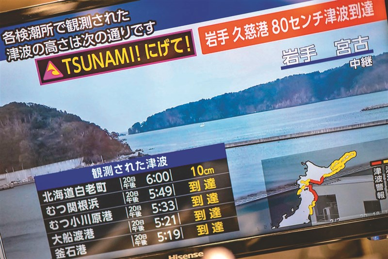 當局針對岩手縣和北海道中部太平洋沿岸地區發布海嘯警報,岩手縣久慈港測得80公分高海嘯、宮古港則是有40公分高海嘯。