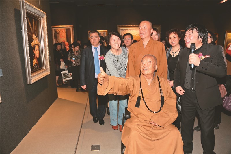 2013年,大陸油畫家李自健(右一)「人性與愛」世界巡迴展在佛陀紀念館展出,星雲大師(前右二)看了畫作,頻頻稱讚。圖/資料照片