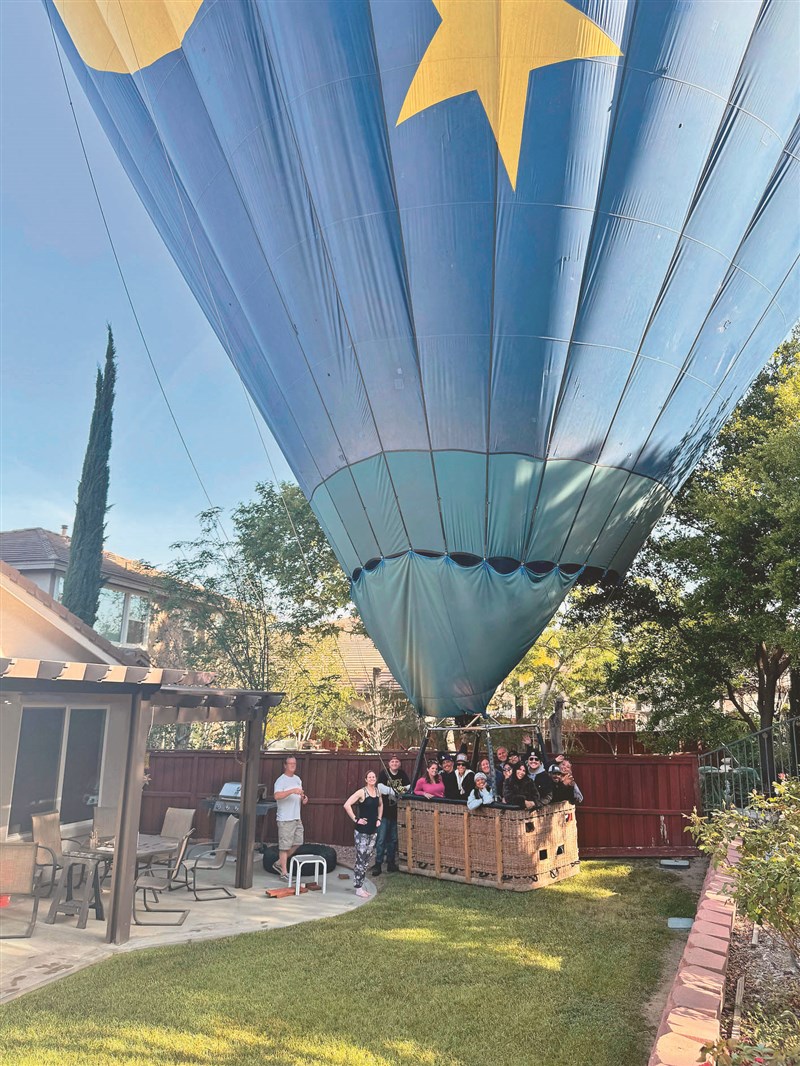 【本報綜合外電報導】美國加州南部特曼庫拉(Temecula)一戶人家最近體驗一場罕見奇遇,一顆載著13人的熱氣球竟降落在自家後院,讓屋主瞬間目瞪口呆。