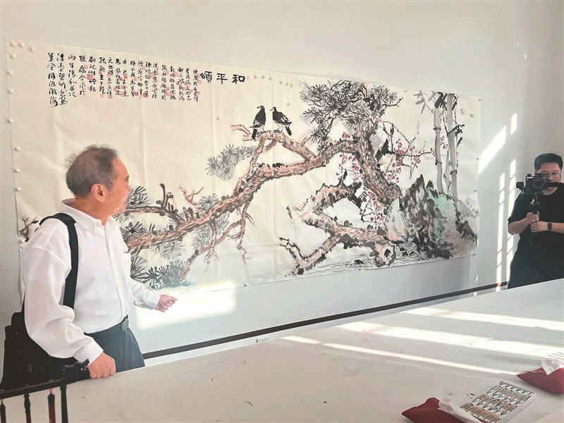 兩岸藝術家交流,共同即興創作出水墨作品〈和平頌〉。圖/邱鏡淳提供