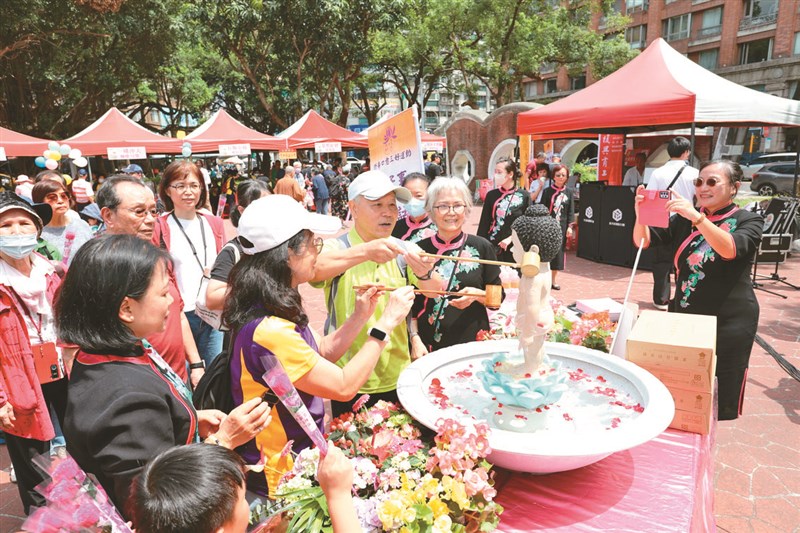 永和區福和里長王淑美讚歎每年的浴佛節都帶給她和里民滿心歡喜。佛光人李秀里參加浴佛25年,兩位孫子從小也跟著拜佛行佛,加入童軍團行列。法會現場設有五處浴佛區,信眾虔誠禮佛祈願。