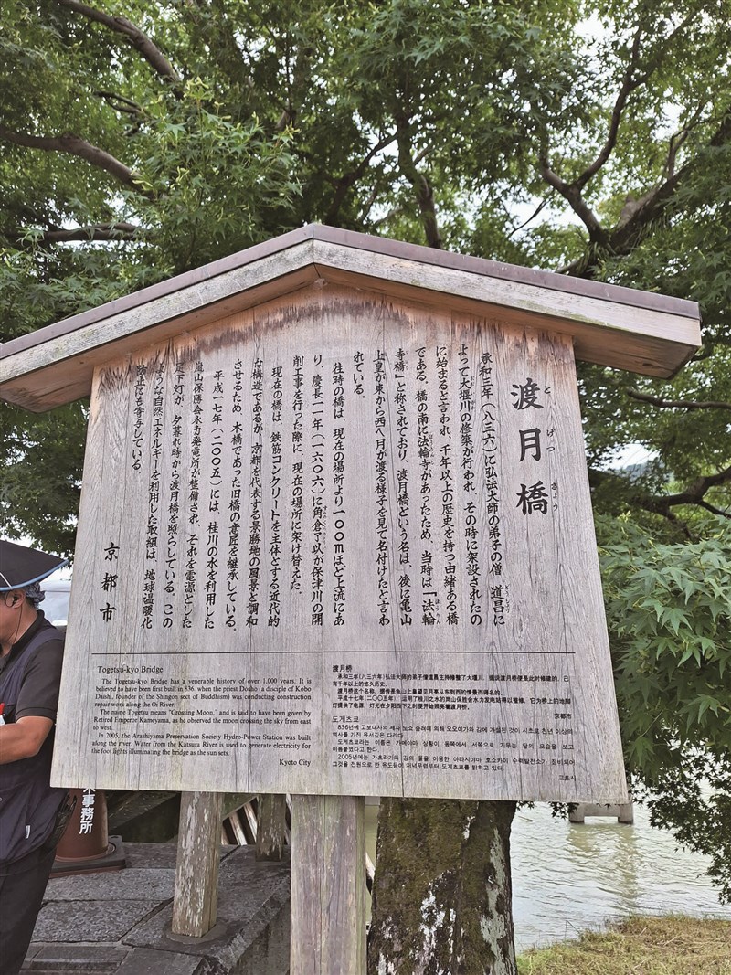 典雅的嵐山渡月橋木牌告示。圖/林孟慧