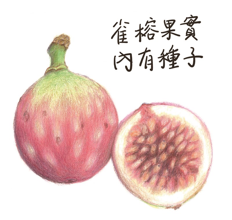 好奇的摘了一顆熟果子,白色乳汁瞬間從花柄流出。剝開粉紅色果子,有看到超級迷你版百香果的感覺,密密麻麻的種子粘附在果肉上。鳥兒開心吃下果肉,同時也吞進了不會被消化的種子,之後這些種子隨著鳥類異地排遺,雀榕又有機會到處抽芽生長了。屋頂、老圍牆、公園、河邊,甚至某一棵樹上,都有機會成為它落地生根的地方。