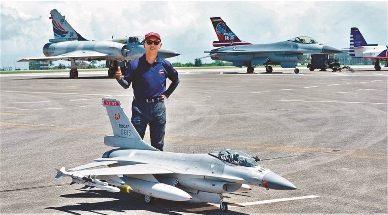 在彰化市經營眼鏡行的洪尚仁懷抱飛行夢,自製遙控戰機模型,也讓眼鏡行地下室成另類空軍基地;圖為洪尚仁帶著遙控飛機模型參加空軍營區的實機展演,期盼更多人體驗飛行快樂。圖/洪尚仁提供