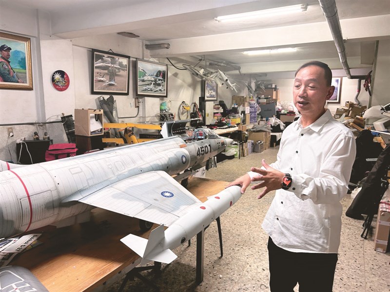 在彰化市經營眼鏡行的洪尚仁(圖)懷抱飛行夢,自製遙控戰機模型,也讓眼鏡行地下室成另類空軍基地。圖/中央社