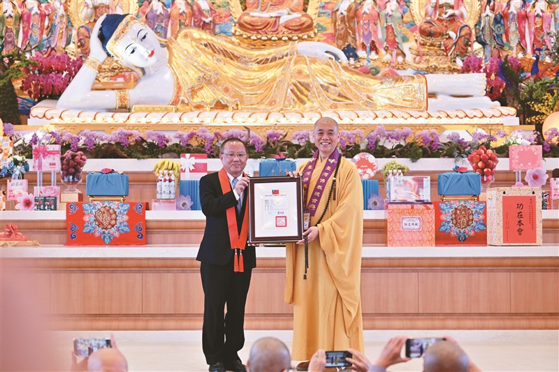 內政部宗教及禮制司司長林振祿(左)頒發當選證書,予台灣佛教總會第26屆理事長會常法師。