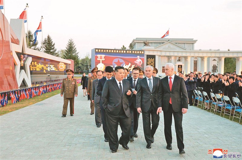 北韓領袖金正恩(前排左)26日在平壤,陪同到訪的俄羅斯國防部長貝洛索夫(前排右)及俄國國會下議院議長沃洛金(前排中),出席海外軍事作戰功勳紀念館竣工典禮。圖/法新社
