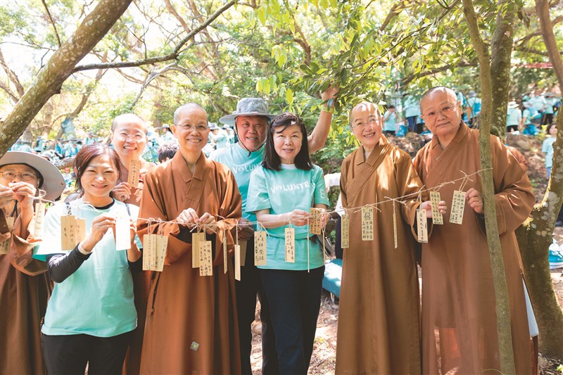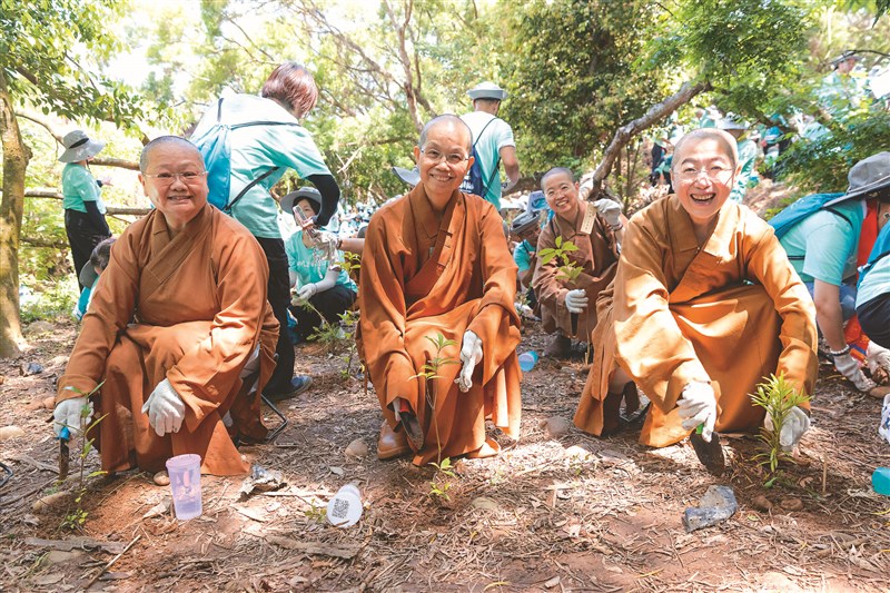 森林覺醒護地球 佛光人種2千樹苗 人間社記者李崑銘、陳淑貞台中報導 |2026.04.28 語音朗讀 135觀看次 字級 大 中 小 滿謙法師(前排右1)、覺居法師(前排右4)、覺培法師(前排右2)、潘維剛(前排右3),將親筆寫的竹片祝福祈願語掛在樹上。圖/人間社記者吳雨彤佛光山、國際佛光會、綠色公益基金會26日於佛光山妙法寺,舉辦「森林覺醒」活動,近2000位佛光人以人牆排成「ZERO」圖騰,宣示執行「零碳排」。圖/人間社記者唐鈺原滿謙法師(左起)、覺居法師、覺培法師種下幼苗,盼森林復育。圖/人間社記者吳雨彤 【人間社記者李崑銘、陳淑貞台中報導】佛光山與國際佛光會、綠色公益基金會共同推動T-Earth森众計畫,進行生命重塑工程,並慶祝世界地球日,26日於台中市大甲區鐵砧山山麓的佛光山妙法寺合辦「森林覺醒」活動,近2000人秉承佛光山開山祖師星雲大師「環保與心保」理念,透過嚴謹的生態復育科學,種下近2000棵樹苗,將原本受外來種侵害的荒地復育為人與自然共生的覺醒殿堂,為後代建構永續的自然資源。為老樹除障 植7成原生樹種佛光山台北道場住持滿謙法師、中區總住持覺居法師與國際佛光會祕書長覺培法師領眾,以人牆排成「ZERO」圖騰,宣示執行「零碳排」;恭讀星雲大師〈為自然生態祈願文〉,祝願幼苗茁壯成林、綠蔭庇眾,使居住在林地的萬物或進入林地者,能接受佛法的洗滌與潤澤,在參天大樹的密林中享受清新的空氣,使大地重現美麗容顏,讓自然回歸莊嚴淨土。法師群領眾靜心體驗茶禪一味,品嘗「森众茶」的甘甜芬芳。滿謙法師與覺培法師共同旁白:欣喜與眾享用綠色公益基金會致力於復育的台灣原生山茶「森众茶」,感受身居森林的清涼與美好,未來將增設禪坐區域,邀請大眾來此進行森林禪。大眾為原有老樹「除障、去垢」,拔除緊緊纏繞住苦楝與無患子的森林綠色殺手「小花蔓澤蘭」,使陽光照進坡地,如佛光普照般地讓大地恢復生機,將有效促進埋在土裡等待因緣成熟的樹木種子生根、發芽,建立高韌性的森林群落。眾人動手植下原生樹種、濱海韌性樹種及香草等約20種幼苗,落實「70%原生樹種」的護理老樹與建立生態棲地理念,以「類宮脇式森林」的密集式方法及「輔助自然再生法」,促使幼苗在眾多林木中出類拔萃、挺立直上。為地球種下愛 實踐共生與共榮大眾紛紛在竹片上寫上祝福祈願語並掛在樹上,領取「覺醒活動證書」。滿謙法師寫「祈願樹苗枝繁葉茂,森林復育成功,地球充滿生機」,覺居法師寫「願眾生充滿愛,社會定靜、世界和平」,覺培法師寫「願世界充滿佛光、大地充滿生機」,國際佛光會中華總會總會長潘維剛寫下「為地球種下愛,實踐共生與共榮」。覺居法師致詞時指出,欣喜大眾同心齊力復育森林,共建優質的佛光童軍五和營地。妙法寺住持覺華法師致詞歡迎佛光人回家,共同種下百年樹人的幼苗。潘維剛則感謝佛光人,齊聚妙法寺共創難得的因緣;感謝連日來的降雨,溼潤乾涸的林地,澆灌如法水般的甘霖潤澤幼苗。台中市政府民政局副局長彭岑凱致詞表示,種樹不但是星雲大師的願心,也是市政府一直以來致力打造美好環境、守護家園、永續經營地球的目標。綠色公益基金會執行長戴慶華表示,感謝佛光山以及佛光會的支持,從2021年開始至今將種植9萬4000棵樹、復育林地坡面面積達50公頃,事前進行田野調查且適地適種,期能建立多樣性複層林相,以自然解方恢復自然生態,進而達成共生與共榮的目標;樹種多達20餘種,其中富蘊經濟價值的台灣原生山茶樹,預計於2027年開始採收,對協助復育並照顧幼苗的原住民同胞增加就業機會,能有效提升當地經濟,建立永續循環的綠色經濟。 前一篇文章 宗教圓桌會議 佛光山分享眾生平等 下一篇文章 印尼佛教學院 青年虔誠皈依 熱門新聞 01全中運張雅佳游泳 3 金 雙破全國2026.04.2402【走讀城鄉】淡水市街清代三合院─施家古厝2026.04.2403衣服晾乾變硬 微觀祕密 2026.04.2204永和學舍慶佛誕 千人浴佛清淨身心2026.04.22052026地球日 行動永續綠色未來 2026.04.2206【詩】諸羅山社2026.04.2407駐巴拉圭大使 參訪巴拉圭佛光山2026.04.2308白宮宗教會議 佛光山參與跨宗教對話2026.04.2209普門寺43周年紀念 千人朝山修持2026.04.2310佛光山中天寺 大雄寶殿佛像安座2026.04.22 訂閱電子報 台北市 天氣預報 台灣一週天氣預報 相關報導 星雲大師西文著作 阿根廷國際書展亮點印尼佛教學院 青年虔誠皈依新馬寺贈《全集》 馬來西亞昔華中學典藏多元信仰交流 佛光人攜手聯合國為兒童點燈台灣佛教總會理事長交接 佛光山祝賀人本關懷深耕長照 蘭陽仁愛之家員工獲獎